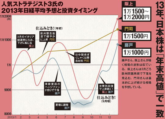 2013年、日本株は「年末高値」で一致 日経平均1万2000円が見えてきた! 日経マネー編集部 南 毅 2012/12/26 http://business.nikkeibp.co.jp/article/skillup/20121225/241511/?bv_rd 2012年11月半ばから始まった円安・株高相場。安倍新政権の誕生が確定した12月17日から過熱気味に動く状況に、そろそろ利益確定すべきか、もう出遅れなのかと多くの投資家にとって迷う状況だろう。 12月21日発売の『日経マネー2013年2月号』では、「ズバリ占う 円安、株高」という特集記事を組み、2013年の為替や日本株、投資信託、米国株の予測記事を掲載した。 今回は日本株相場の見通しを掲載する。 興味のある方は、"つづきはこちらです"をクリック!