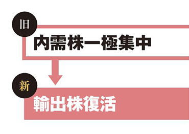 典型例は為替の動きだ。円安トレンドへの転換により、内需株一辺倒だった12年とは様変わり、輸出株の復活が始まる。