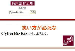 「笑い方が必死なCyberBizKizです。よろしく。」 ・・・って、何なんだぁ~・・・これは。。。 どう見てもドン引き確実な自己紹介だぁ~・・・ もしよろしければお試しを! 自己紹介工場 PR |