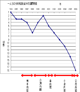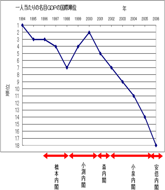 小野盛司著 ナビ出版刊 発売開始 緊急提言 小泉構造改革は、実は失敗だった! 今回の参議院選の自民党の大敗も、背景には経済政策の失敗があり、成長しない経済では将来不安が拡大し、国民は年金の心配をし始めている。デフレのお陰で日本はどんどん貧乏になっている。世界のGDPにおける日本の比率は一九九九年の十七%から二〇〇五年には10.3%にまで落ちた。一人あたりの名目GDPは一九九三年と一九九四年には世界一であったのに、二〇〇六年には十八位まで低下した。何とこれは一九七一年の水準なのだ。二十二年もかけてやっと世界一の豊かな国になったのに、小泉・安倍政策によって一気に貧乏な国へと逆戻りしてしまった。欧米を時々訪れている人は、欧米の所得水準がどんどん向上し、日本との所得格差がどんどん広がっていることを実感しているだろう。下の図を見て頂きたい。緊縮財政の橋本内閣のお陰で、7位に転落したが、積極財政を行った小渕内閣では、2位まで挽回している。シミュレーションにより、積極財政でGDPが増大し、税収が増え、財政が健全化することが分かっているのに、なぜ積極財政に反対するのか。 PR |