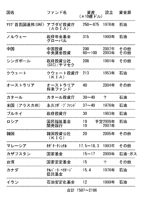 最近では、SWFにより、先進国の有名企業が買収される例も目立ち始めて 買収した企業やその国への政治的な影響力をもつ可能性もあり 米大手証券のモルガン・スタンレーによると、2007年9月の政府系ファンドの 今後、世界の市場は、SWFの動きに大きく影響され、一国の暴走が世界経済を混乱に陥らせる危険性が急速に高まりつつある。