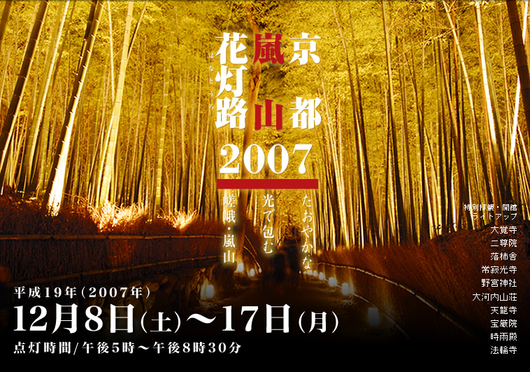 嵯峨・嵐山地域の自然、水辺空間、竹林や歴史的文化遺産、 野宮神社から大河内山荘に至る散策路両側の竹林をライトアップし、 渡月橋と山裾、水辺など周辺一帯をライトアップし、