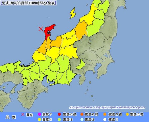 3月25日午前9時56分の気象庁地震火山部発表によると、 この地震の影響で、JR西日本の午前10時30分までの情報によると、 上越新幹線も全線で運転を見合わせている。また、日本道路高越情報センターの25日午前10時ちょうどの情報によると、北陸地方にあった地震の影響で、 同日、北陸電力はこの地震で非常災害対策総本部を設置し対応に当たると 震度4以上が観測された地域 新潟県 震度5弱 新潟県中越 富山県 震度5弱 富山県東部 富山県西部 長野県 震度4 長野県北部 長野県中部 福井県 震度4 福井県嶺北 岐阜県 震度4 岐阜県飛騨 震度5強以上が観測された市町村 新潟県 震度5弱 刈羽村 富山県 震度5弱 富山市 滑川市 舟橋村