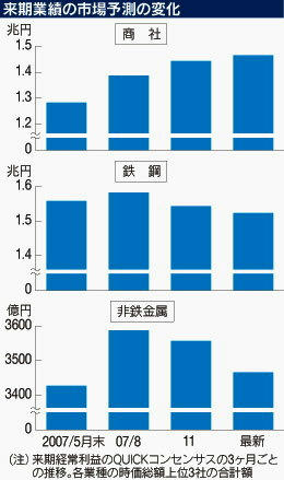 株式市場は米景気だけでなく、世界景気の減速をも織り込み始めた。一変したのが商社、海運、鉄鋼など資源関連とされる銘柄への市場の見方だ。新興国の旺盛な需要の恩恵を受けるとの期待が昨年の買い材料だったが「大相場は終わった」(三菱UFJ証券の藤戸則弘投資情報部長)との声も聞かれる。しかし、買い材料は本当に消えたのか。資源関連とひとくくりにされがちだが、経営を取り巻く環境は一律ではない。来期業績のQUICKコンセンサス(=アナリストの予想平均)をみると、業種ごとの勢いに明確な差が出ている。 上方修正が続いているのが商社だ。QUICKコンセンサスの3カ月ごとの推移をみると、今期の四半期業績が発表されるごとに上ぶれしている。しかも「資源価格の高騰が本格寄与するのは来期」(野村証券の成田康浩アナリスト)だ。鉄鋼原料は07年の需給逼迫(ひっぱく)を受け大幅な値上げが確実。鉄鉱石の取扱量が多い三井物産は、価格がトン当たり1ドル上がれば純利益を年26億円押し上げる。1月末の業績発表会見の席上、今井和也副社長は「価格の見通しは言えません。来期の利益は皆さんで計算してください」と余裕の笑みを浮かべた。ゴールドマン・サックス証券の吉田憲一郎アナリストの試算では、鉄鉱石と石炭の価格上昇による純利益の上乗せは三井物産で年690億円、三菱商事で900億円に達する見込みだ。商社は原油高でも恩恵を受ける。油田権益を持つ海外子会社は12月決算で、「直近の高騰は今期業績にはさほど乗っていない」(成田氏)ため、収益を本格的に押し上げるのは来期だ。つまり、石油元売りと違い商社の石油事業はガソリンスタンドなど下流部門はなく、原油価格の上昇は増益に直結する構図だ。 一方、鉄鋼、非鉄金属は業績拡大に陰りがみえてきた。鉄鋼は原料価格や海上輸送運賃の上昇が重荷となる。JFEホールディングスの山崎敏邦副社長は「海外中心に受注に衰えはなく、価格修正は進んでいる」と強気の姿勢をみせるが、業績発表後は大和総研などが投資判断を引き下げた。非鉄でも銅、ニッケルなど主力商品の市況下落が響く。 現状では資源関連の株価はこうした事業構造の違いを反映しているとは言い難い。予想PER(株価収益率)は商社から鉄鋼会社までおしなべて10倍前後と低いままだ。主因は「株式の需給面の重しがなかなか解消されない」(成田氏)ことだ。昨年まで海外投資家が好んで組み入れてきた銘柄だけに、信用収縮懸念の広がりで株の持ち高を減らす流れに押されている。ある海運大手の財務担当役員は昨年末、欧州の機関投資家から「運用担当者としては持ち続けたいが、会社の方針として売らざるをえない」と告げられたという。 しかし、明るい材料もある。株式需給悪化の一因だった信用買い残の整理が急速に進んできたことだ。三井物産の信用倍率は1月18日には16.7倍に達していたが、2月1日には5.7倍まで低下した。三菱商事も同時期に6.8倍から3.7倍に下がった。相対的にはなお高水準だが、もつれた糸は徐々にほぐれつつある。資源関連銘柄は相場全体が弱含むと真っ先に売られやすい特性があるのは事実。それだけに買いのタイミングはつかみにくいが、相場が転換期を迎えれば好業績株の反発力も大きいはずだ。 PR |