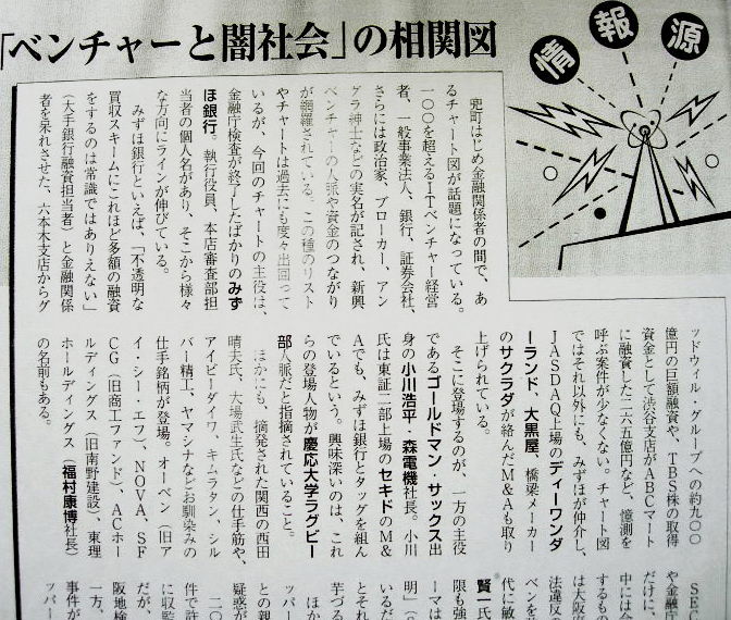 会員制情報誌「ベルダ」3月号に「ベンチャーと闇社会の相関図」(=写真) チャートには、六本木支店からグッドウィルGの900億円の これらの登場人物が慶応大学ラグビー部人脈だと指摘されていること 月刊誌ベルダ3月号・記事紹介 PR |