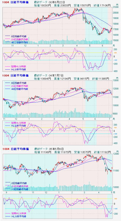 (3) 2005年4月15日 上のチャートは2005年前半の相場で、その前年の12月から半年近く 上昇した後、2004年4月半ばに急落しました。 しかしチャートから見られるように、3月末にはHL分析平均線はすでにマイナスと なっており、日経平均株価は実質的には3月はじめにピークをつけていました。