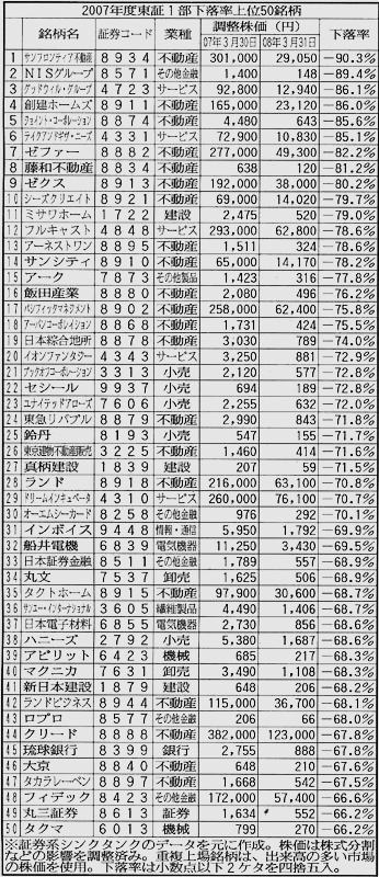 サブプライム直撃、不動産業が4割 ZAKZAK 2008/04/07 日経平均株価が1万3000円を回復したものの、2007年度の暴落の傷がいまだに癒えない東京株式市場。上場条件が厳しく、ステータスが高いはずの東証1部にでさえ、07年3月末から08年3月末までの1年間で株価が10分の1以下になった銘柄もある。同部の下落率ワースト50銘柄をピックアップしてみると、日本経済の“病んでいる部分”が見えてくる。 興味のある方は、"つづきはこちらです"をクリック!