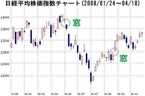 □NYSE(NYダウ) 12849.36(+228.87)△1.81% 週末のNY市場も大きく値を上げているので、本日の日本市場も まず、上にある日経平均株価チャート(2008/01/24~04/18)を まずは ・・・処に「窓」が空いていますので、そこの「窓」を目指して ちなみに 今週は一旦、節目の週となるかと思います。 デイトレは騰げ始めを確認したら飛び乗って、騰げが止まったら利確です。 『4/21 注目&注視銘柄』は、"つづきはこちらです"をクリック!