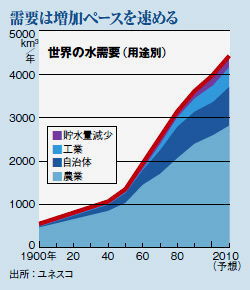 同氏はさらに、水資源の節約と適正な分配に取り組まない限り、企業は水の確保に苦しむことになると警告。唯一の解決策は市場原理の導入だと主張する。水の無駄遣いを防ぐには、適正で現実的な価格設定が必要だという。 ネスレが水問題に取り組んでいるのは、善き企業市民を目指す活動の一環だ。かつて同社は途上国で粉ミルクを売り込み、汚染された水で溶いた粉ミルクを飲んだ乳幼児が死んだ。活動家は母乳を与えていれば避けられた事故だと訴え、一部消費者の間で30年に及ぶネスレ不買運動が起きた。 不適切な価格のせいで生じる最大の問題は、「仮想水(食糧や工業品の生産に使われた水)」の取引に見られる。水不足の国が農産物や工業品の輸出を通じて水を大量に輸出しているのだ。 穀物輸出国オーストラリアの仮想水輸出量は世界最大。7年間渇水に苦しんだ同国の農家は世界一効率的に水を使うようになったが、これほど水の少ない国が輸出用の灌漑作物の栽培を手がけることに意味があるのか疑う向きもある。 消費者は仮想水取引にあまり気づかないが、多くの商品の価格は、その生産過程で使われた水が非常に安いことを示している。英非営利団体ウオーターワイズによると、安いジーンズを1本作るのに最大1万1000リットルの水が使われる。1ドルしないハンバーガーには2400リットル以上の水が必要だ。 農業用水は直接・間接的に国の援助を受けていることが多い。そのため農家にとって水は「非常に安い」(UNDPのアンドリュー・ハドソン氏)。これが深刻な問題を招いている。UNDPの推測では、インドの一部地域で地下水面が年間1m以上下がっており、将来の農業生産を危うくしている。 農業以外でも、補助金などを受け、水を無料あるいは安く確保している産業がある。UNDPはこう結論づける。「水の管理は今、借金で散財するのと同様の無謀で持続不可能な様相を呈している。補給率で測ると、各国は保有量以上の水を使っている」。このため将来の問題が積み上がる。世界人口は現在の67億人から2050年には90億人に増えると予測されている。 では、どうすれば水を適正価格にできるのか。非政府組織の多くは、水を基本的人権としてとらえるべきだと考え、料金引き上げに不信感を抱く。 ウオーターエイドの政策担当ヘンリー・ノースオーバー氏は、一部の途上国では水の統治組織が未熟であるため水に価格をつける試みが妨げられていると言う。「安定した国家機関と有効な政治体制があって初めて、価格設定が供給規制の手段として機能する」。 ハドソン氏は、特定の条件が満たされれば価格は適正になり得ると考える。「1日の生活に最低必要な水20リットルを供給する仕組みは不可欠だ。そのために国は補助金を適切に使い、水へのアクセスを構築する必要がある」。 大半の国が水の価格を規制しているが、“誤った補助金”のせいで適正価格に落ち着かないことが多い。そこでブラベック氏が代案として提案するのが、水利権の市場取引だ。 彼はこの構想を、欧州の二酸化炭素の排出枠取引になぞらえる。キャップ・アンド・トレード(C&T)方式で企業に排出枠を課し、過不足分を売買させるこの制度を水に導入すれば、企業や農家は一定量の水の使用権を認められる。割当量より多く使いたい時は取引市場で権利を買わねばならない。 何も新しい構想ではない。オマーンの砂漠の民は何千年も前から水の利用権を取引してきた。最近ではネスレの故郷スイスの一部地域で、各農家が用水路から使用する水量を定め、栽培作物に応じて権利を売買しているという。 米慈善団体、環境防衛基金のフレッド・クルップ代表はこの構想を熱烈に支持し、今年1月のダボス会議で「C&Tのような市場ベースの手段が適切に設計・運用されれば、水問題の解決にも役立つ」と語った。