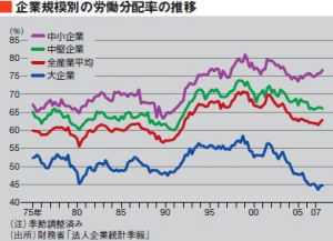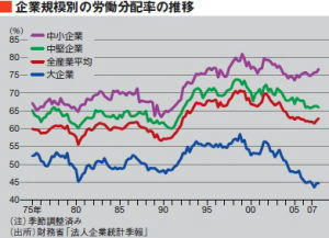 正社員の場合は給料から天引きだから滞納はほとんどないが、非正規雇用になって国民年金や国民健康保険を支払うのは随時になるから滞納が増えてしまう。そのために後期高齢者医療保険では年金から天引きにしましたが、天引きにしないと滞納が増えてしまうからだ。 小泉構造改革で人材派遣などの規制緩和が広がり、大企業などでは正社員から非正規雇用に切り替えが進み、年収が300万以下の非正規雇用の労働者が増えた。つまり中高年の首を切らない代わりに(CYberBizKiz=既にバブル崩壊後にリストラで切るべき人材は既に首を切って、もう切る首がなかった)、新規採用をストップして派遣社員で穴埋めする事によって会社の業績を上げることが経営の主流になった。 冒頭のグラフを見れば分かるように、中小企業に比べると大企業の労働分配率が、小泉内閣が発足した2001年から激減している。それに対して中小企業は正社員から非正規雇用への切り替えが進んでいない状況が読み取れる。すでに正社員も賃金が非正規雇用並みに低くなっているのかもしれない。 表題の「給料がなぜ上がらないか」という問題で、最近では原材料価格の高騰で利益が削られて人件費が抑えられているという見方が有力ですが、大企業は下請け企業に原材料費のしわ寄せをしているようだ。ダメなら中国から輸入して取引を切られてしまうから下請け企業は受けざるを得ない。(CYberBizKiz=圧力は相当であり、今後、事故等の懸念の方がリスクである) このように中国が世界にデフレを輸出して、人件費も製品価格も抑えられてしまう状況が続いている。日本も輸出で経済を回している以上は中国に対抗できるだけの安売りをしなければならず、国内のコストは限りなく削られるようになっている。このようなことが90年代から最近まで続いているのですが、中国や中東の産油国などに富が移転して、相対的に日本が貧しくなっているのだ。 だから中国や中東産油国は経済的に豊かになり、超高層ビルが林立するようになった。日本は貿易収支などは黒字を続けているのですが、全体の経済は好調でも消費が低迷して、国民所得水準は低迷したままだ。輸出大企業は利益を上げていても国内に波及してこないでアメリカにドルのまま利益が滞留してしまっているからだ。 グローバル経済化で世界的な経済構造から分析していかないと、日本の経済も分析できなくなってきていますが、それには中国やインドや新興国などがこれからどうなるかを分析しないと日本経済の先行きも分析できない。中国やインドがこのまま高度成長して日本に追いついてくるのだろうか? 中国やインドが高度成長すれば当然人件費などのコストも上がるはずだ。それに伴って日本の相対的な経済競争力も上がってくるはずだ。現に中国などでは人件費などを初めとして原材料費などの高騰も激しくなってきた。だからグローバル企業は中国からインドやベトナムなどに工場を移転させている。一部は工場も国内に回帰してきている。 だから日本も最悪の状況は脱してきたと言えるのでしょう。そして石油などの原材料価格の高騰はエネルギー効率のいい日本のほうが有利な面も出てきた。中国やインドはエネルギー不足で停電や物流の停滞など激しくて有利ではなくなってきたからだ。そして豊かになった中国人やインド人は食べ物や日用品なども高級品を好むようになって日本からの製品や食料の輸出も多くなるだろう。 国際的な原材料価格の高騰は人件費の安さだけでは競争できなくなり、大量生産や大量消費が出来なくなり、長持ちする高級品が好まれるようになる。安かろう悪かろうの製品では売れなくなり、これまでの中国ブームは近い内に終わりを告げるだろう。毒入りギョーザ事件がその象徴になるだろう。 中国の巨大市場に釣られて日本から20000社も企業が進出した事が、日本の人件費の抑制につながりましたが、これらの企業の一部が国内に回帰してくれば雇用状況も変わってくるだろう。この数年は新卒者の奪い合いが起きていますが、これらが雇用情勢の変化を感じさせますが、非正規雇用者の正社員化も起き始めて来た。 大企業にとっては原材料価格の高騰が一番の問題になってきていますが、となると通貨の強い国が有利となり、通貨の弱い国がインフレなどで経済競争力が弱くなるだろう。石油などの原材料は中東などに偏在しておりアメリカや中国のような通貨の安い国はガソリンなどが高騰する。日本は円が高いお陰でさほどは高くならない。 このような事は70年代にも起きましたが、日本は省エネの自動車などが売れて高度成長した。そして現在は石油が1バレル135ドルにもなって第三次石油ショックが来ている。そうなると70年代のように省エネ時代となり日本のような省エネ国が有利になる。アメリカのような大量消費国は貧血状態になり中国もエネルギー効率が最悪で石油ショックのダメージをまともに食らうだろう。 国際金融資本は