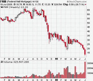 Fannie Mae(連邦住宅金融抵当金庫)の株価がどど~んと落ちつつある。 Wikipediaによれば ・Fannie Maeは1938年にルーズベルト政権下での「ニューディール政策」の一環として設立 ・大恐慌で壊滅的な打撃を受けた住宅ローン市場に流動性を持たせるのが目的だった ・1968年に民営化 Fannie Maeは、証券化された住宅ローンの債務保証を行う。つまり、Fannie発行の住宅ローン証券を購入した人には、その元となる住宅ローンの返済が滞っても、元本と利息が支払われる。 が、昨今の住宅市場崩壊で、住宅ローンの返済不能が急増している。この結果、債務保証が重荷となり、Fannie Maeは実質債務超過(Insolvent)ではないかという懸念が広がっている。 Bloomberg: Fannie, Freddie `Insolvent' After Losses, Poole Says Fannie Mae等が保証する住宅ローンの金額は...5兆2000億ドル。そして、手元にある準備金は800億ドル。さらにFannieは8000億ドル、Freddieは6000億ドル以上の社債を発行して資金調達をしている。 住宅価格が5%下落しただけで、準備金は吹き飛ぶ。かといって、これ以上の資金調達に応じる投資家がいるとも思えない。つまり、政府が(というか、米国納税者が)税金で救うしか手はないであろう。 そのとき、米国国債の格付けはAAAを維持できるのであろうか?