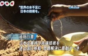 NHKニュース 7月15日 11時20分 政府は、ことしの通商白書で、地球規模で深刻化する水不足の問題を初めて取り上げ、日本企業が持つ海水を淡水化する技術などを水不足に悩む国々に移転して問題の解決に貢献すべきだと指摘しています。 白書によりますと、新興国や発展途上国での経済成長や人口増加を背景に水不足が地球規模で深刻になり、西暦2025年にはおよそ18億人が水不足の状態に陥るおそれがあるとしています。このため、海水を淡水化したり下水を浄化したりして飲み水を作り出す技術や、工場で使用した水を再利用する技術など、日本企業が持つ先端の技術を中国、インド、中東諸国それにアフリカの途上国に移転し、問題の解決に貢献すべきだと指摘しています。さらに、白書では、水ビジネスの市場規模は2025年には世界で100兆円に達するとみられるため、日本企業は、水に含まれる不純物を除去する装置の低コスト化や高性能化を進め、積極的に海外進出を果たすべきだとしています。