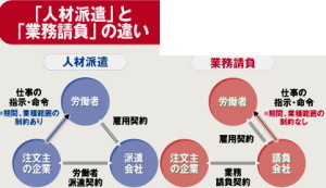 なので違法業者が非常に多いんだけれども、今度は完全に請負業者だけが ちなみに上の図は「派遣」と「請負」の仕組みの違いを表わしています。