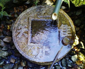 神前、仏前で口をすすぎ、身を清めるための水を確保するための鉢です。 龍安寺(りょうあんじ)の茶室「蔵六庵」の露地にある蹲踞には 「吾唯足知」は茶道の基本である禅語です。