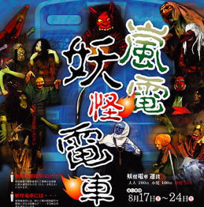 京都新聞 2008年8月15日 京福電気鉄道が昨年に引き続き、不気味に装飾され効果音が流れる車内を、おにひとくち、つのじろうなどさまざまな妖怪が歩き回る電車を企画した。 この日は、妖怪たちのお披露目として、夜に1回だけ嵐山から運行。突然現れた妖怪の怖い形相に泣きだす子どももいたが、若者たちは一緒に記念撮影したりと楽しんでいた。妖怪電車は17日から24日の午後5時台から9時台まで、嵐山本線と北野線で各日計7本運行する。 ─…─…─…──…─…─…──…─…─…──…─…─…─ 確か運賃が大人200円、小人100円で、 気にするような運賃では無いんだけれども、