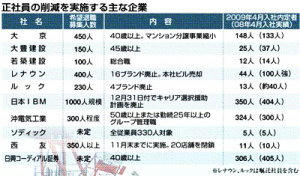 ◆「売るものはない」 市況悪化に苦しむ不動産業界では、分譲マンションの日本綜合地所が09年4月入社予定だった学生53人全員の内定を取り消した。10月1日に内定式を開いたばかりだが、担当者は「業績下方修正で財務体質が悪化。固定費削減のため、やむを得ない」と苦しい状況を語る。10年度の採用計画は「白紙状態」とし、今後は「人員も含めたコスト削減を検討する」と正社員のリストラも視野に入れる。 分譲マンション大手の大京は事業縮小に伴い、今月から希望退職者の募集を始める。40歳以上を対象に全社員の1割に当たる450人を募り、退職金の割り増しなどで約25億円の特別損失を計上する見込みだ。同社は「マンション市況の低迷は続く。全体の人員配置を見直す」と説明。09年4月入社予定者148人(グループ全体)は採用する見通しだが、10年4月入社の採用は「慎重にみている」と減少は避けられそうもない。 アパレル大手では、09年3月期で3年連続で最終赤字に陥る見通しのレナウンが1月末までに希望退職者400人を募集する。不採算の16ブランドの廃止や本社ビル売却も決めており、「もうほかに売るものはない」(中村実社長)。09年4月入社の内定者数は08年4月入社の半分程度の44人に抑えた。 電機業界では、OKI(沖電気工業)が来年1月5日から2月6日まで、満50歳以上または勤続25年以上のグループ管理職を対象に、早期退職者を募る。半導体子会社をロームに売却し間接部門の管理職に余剰感が生じたためだ。募集は1993年以来。300人程度の応募を予想しており、特別退職金を含め約40億円の費用発生を見込む。 ◆米シティから飛び火 米国の親会社のリストラが日本に波及したのが証券大手の日興コーディアル証券。経営が悪化した米金融大手シティグループが全世界で5万人の従業員削減を打ち出したのを受け、11月下旬から幹部も含めた40歳以上の社員を対象に希望退職の募集を始めた。応募者に割増退職金を支払うという。さらに取締役や執行役員の削減を軸にした役員体制の見直しも発表。現在、18人の取締役を2人、16人の執行役員を3人、12月末までにそれぞれ減らす。日興コーディアルは「経営資源の戦略的配置と意思決定の迅速化を可能にするため」と説明。09年4月入社予定の内定者は306人と前年実績より約100人少ない。10年度採用計画については「現段階では未定」という。 流通業界では、約20の不採算店舗の閉鎖を進めている西友が350人以上の希望退職を募集し11月中に実施した。詳細は明らかにしていないが、主に店舗の従業員が対象だったという。 景気悪化のスピードが速く、人員削減は非正規労働者にとどまらず正社員や来春採用予定者の内定取り消しにまで広がっている。10月の完全失業率は不況で職探しをあきらめた人が増えたこともあり3.7%と前月比0.3ポイント低下した。 しかし、企業のリストラは今後、本格化する見通しで「失業率は09年度前半に4%台後半に上昇する」(エコノミスト)などと雇用情勢の悪化を予想する声が大勢だ。 PR |