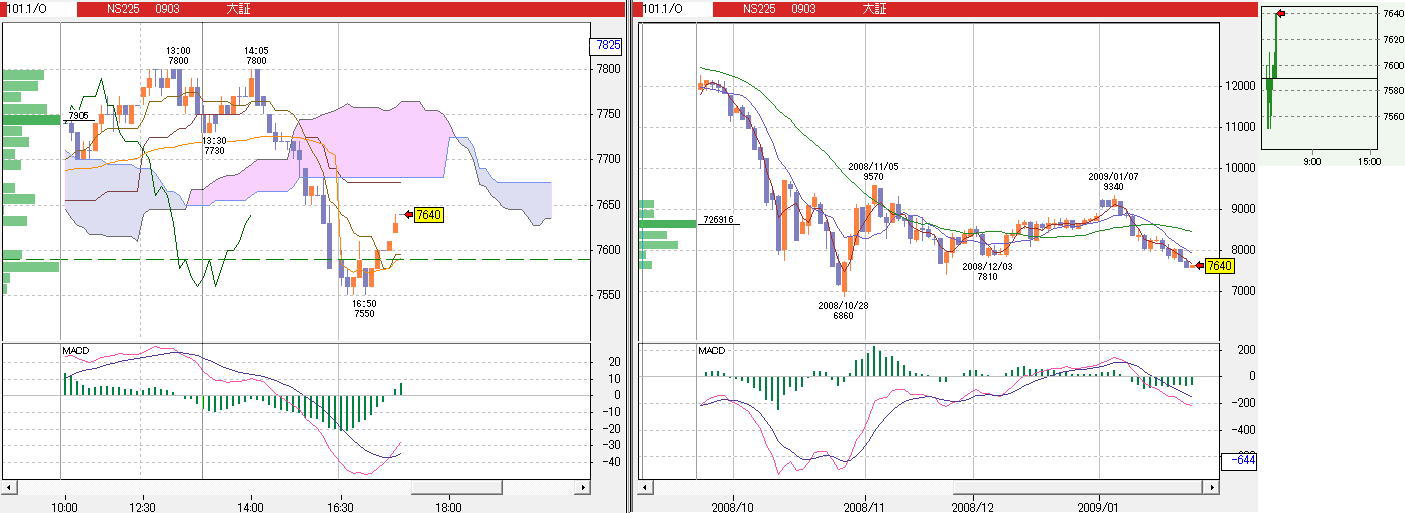 先物市場での仕掛け的な動きも随所ではみられたが、8100円を超えさせる参加者は現れなかった。 基本的にはリバランスが中心であるため、上へのトレンドを仕掛けたとしても追随は限られ、反対に節目では一旦クローズ、若しくはショートに傾けるといった動きのようだ。 個別では決算を手掛りとした物色や、本日は全体のこう着感が強かったこともあって、ここ最近一服していた次世代エネルギー関連の一角なども物色されていた。 また、テクニカル面では下値模索が続くが、MACDの陽転シグナル発生が近づいてきている点は注目したい。 ─…─…─…──…─…─…──…─…─…──…─…─…─ MACDの話が出てきたので、チョット他所からチャート(上記)などを 基本的な買いシグナルです。 ですが、それが効かない世界があります。 少し儲かる程度で満足し、それを逃がさない努力をして初めて損をしない。 チャートの左の短期(5分足)ではMACD買いシグナル点灯なんですが、 ・・・そういう事なのです。 本日の日経225で説明したかったのですが、 PR |