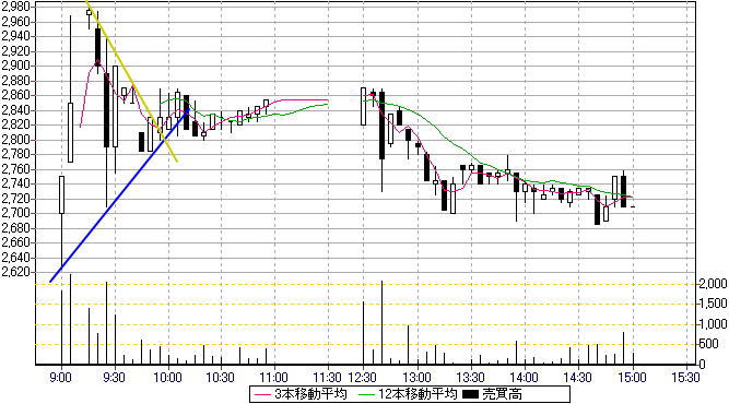 まず、 です。 そして、「青」「黄色」の直線がありますが、 そして「青」直線と「黄色」直線が交差した処で、上に行くか下に行くか 次に「青」の直線部分で、10:05の処で一旦、「青」の直線部分を割って なので、コレも出来るだけ素早く高い処で一旦利確です。 まぁ~基本的に暴騰して、その後、恐怖の暴下げ処を狙うのが 下がって来ているが、買いかなぁ~・・・なんて思っていても、 なので、お使いの証券会社の「五分足チャート」を そして、デイトレするなら出来高の多い銘柄。。。 動きの少ない、売買の少ない銘柄は止しましょうね。 ちなみに「(8902)パシフィックHD」は、いつ倒産してもおかしくない
