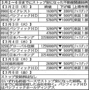 ■監査意見の不表明は「信用なし」のらく印 「3月危機説」が株式市場でくすぶるなか、不動産関連株が不安定な値動きをみせている。なかには、3月に入ってからほとんどの日がストップ安という銘柄もある。不動産は不振業種の代名詞的な存在になっているだけに、悪材料の出た銘柄は容赦なく売り浴びせられているようだ。 3月に入ってから6日までの5営業日にストップ安に見舞われた不動産関連銘柄は6銘柄=表。 特に目立ったのが、5営業日のうち4営業日でストップ安に見舞われたパシフィックホールディングス(HD)。ほかにも、ランドと日本パーキングが2営業日でストップ安となった。 東証1部上場(4月1日付で2部に指定替え)の不動産投資会社、パシフィックHD(東京)は2月27日、2008年11月期の有価証券報告書に関して、会計監査人の監査法人トーマツから監査意見を表明しないとする監査報告書を受け取ったと発表。投資家の間に不安が広がった。 発表を受け、東京証券取引所は同日、同社株を上場廃止の可能性がある監理銘柄に指定した。 興味のある方は、"つづきはこちらです"をクリック!