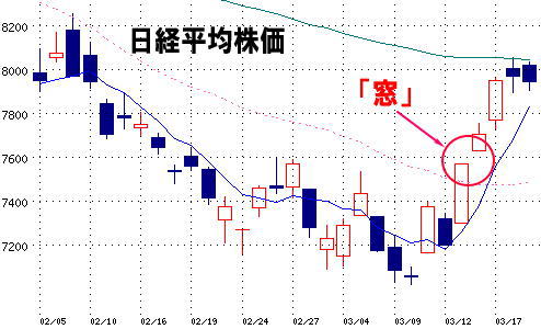 3/10 \7021.28- ~ 3/18 \8054.35- まで 1000円以上騰げたのですから反落するのは当然なのですが・・・ 3/13 \7571.45- と、3/16 \7630.20- 処に 上記チャートで示しているように「窓」があります。 その「窓」を埋めに掛かるかと思います。 「窓」を埋めてから、再度上昇に向かうのではないでしょうか。