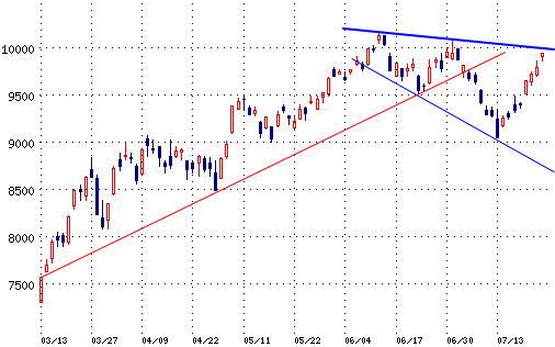 上記チャートについてコメント欄よりご質問がありましたので 上記一番上の青い線が上値抵抗線となっており、10000円を少し越えた程度しか 赤い線は、既に上げトレンドは終わっている事を示すためのモノです。 実はもっとややこしい事をしなければならないのですが、